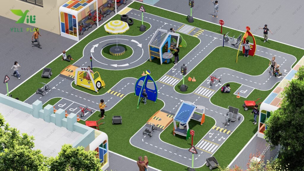 This playground is not only fun but also educational. Children learn about basic traffic rules, road safety, and community life through interactive role-play. While pretending to drive or shop, they also practice teamwork, problem-solving, and communication. Moreover, these activities help develop motor skills such as coordination and balance.
